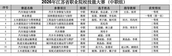 近日,2026年江苏省职业院校技能大赛(中职组)各项赛事圆满落幕。苏州建设交通高等职业技术学校参赛团队捷报频传、硕果累累,一举斩获3枚金牌、4枚银牌与4枚铜牌。本次省赛时间紧、赛项规程变化大但各参赛队的训练工作依然有条不紊,训练节奏紧凑。优异成绩的取得充分展现了我校职业教育的过硬水平与办学实力。